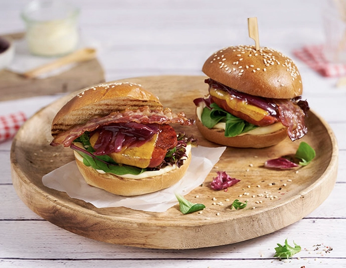 Chorizo-Cheese-Burger mit Rotweinzwiebeln