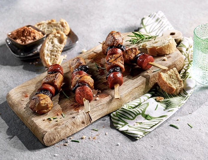 - Die Spieße aus der Marinade nehmen, trocken tupfen und auf dem vorbereiteten Grill bei direkter Hitze auf beiden Seiten etwa 3 Minuten grillen, bis alles durchgebraten ist. Mit knusprigem Brot und etwas Aioli genießen.