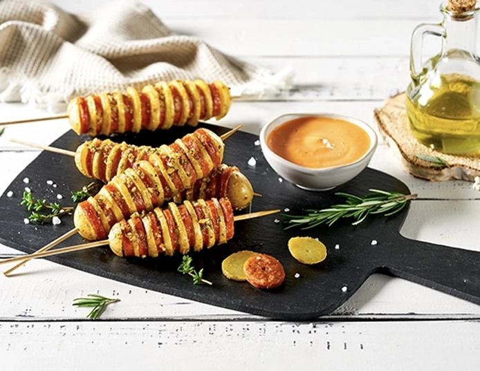 - Die knusprigen Chorizo-Kartoffel-Spieße zusammen mit dem Paprika-Dip genießen.